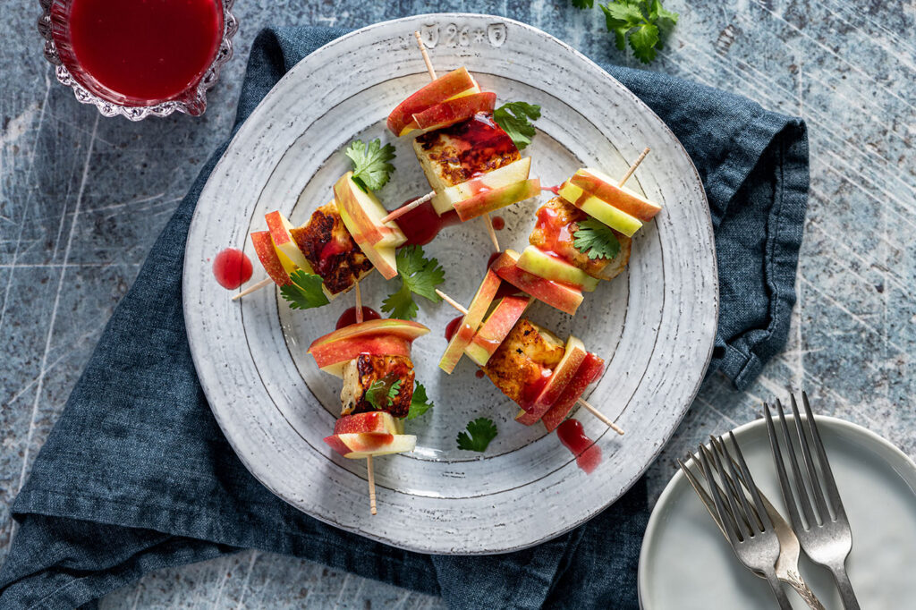 For the ultimate quick and easy appetizer, we paired sweet Honeycrisp apples with salty halloumi cheese, a dry Greek cheese that holds its shape when grilled. A drizzle of raspberry vinaigrette gives the apple and cheese combo just the right amount of acidity. A simple but delicious sweet and savory combination that can be skewered for small bites or tossed in a salad with mixed greens.