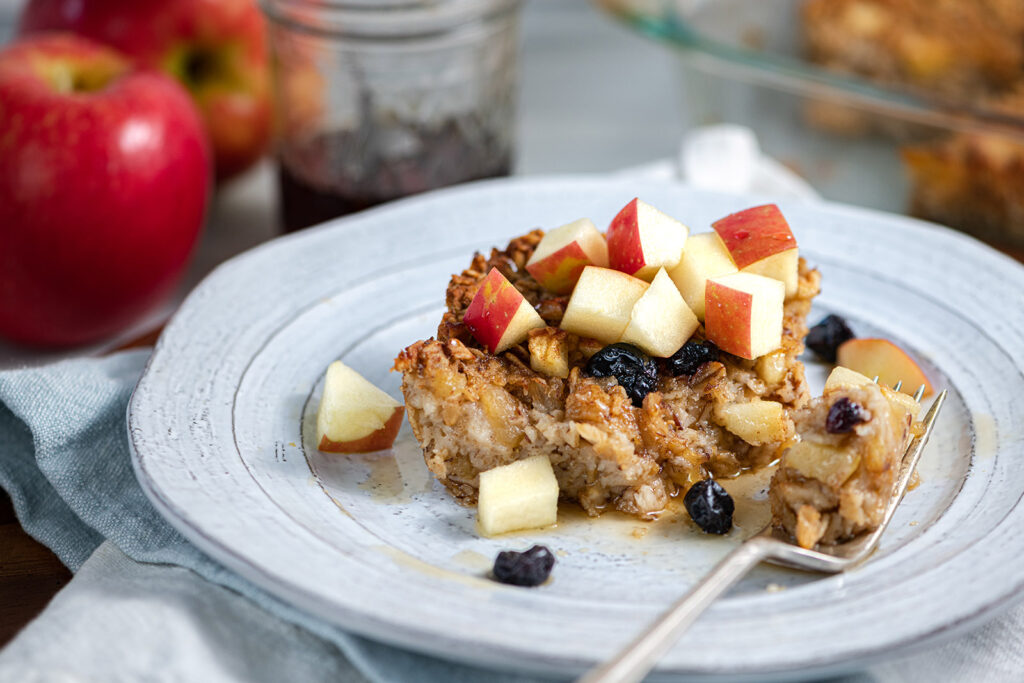 - To serve, cut baked oatmeal into squares, combine remaining 1/2 cup of diced apples with 2 tablespoons of maple syrup and spoon over oatmeal squares.