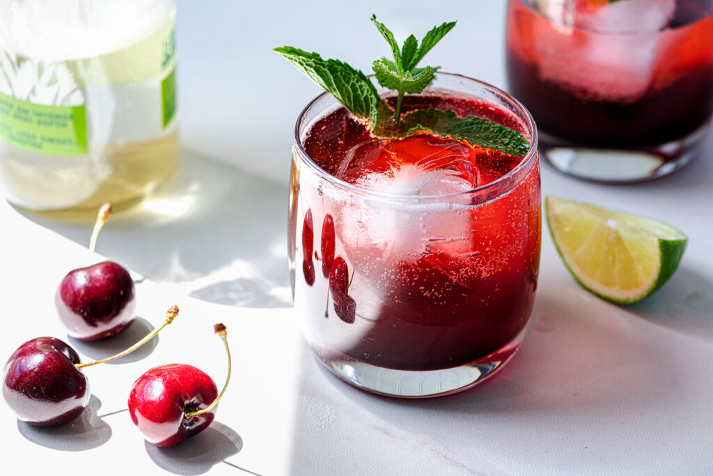 For this nonalcoholic cocktail, we start by cooking dark sweet cherries down to make gorgeous ruby-colored syrup. Not only does this intensely flavored cherry syrup spruce up a cocktail, but it can be used in so many different ways: syrup for pancakes, glaze for grilled meats and a topping for vanilla ice cream.