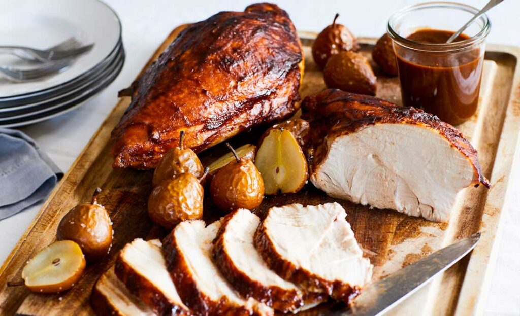 - To carve the turkey, cut the meat away from the bone in one large piece using a sharp knife, then cut it crosswise (against the grain) into 1/2-inch thick slices. Arrange the turkey slices on a serving platter with the roasted Seckel pears lining the edges. Serve with the extra BBQ sauce passed at the table.